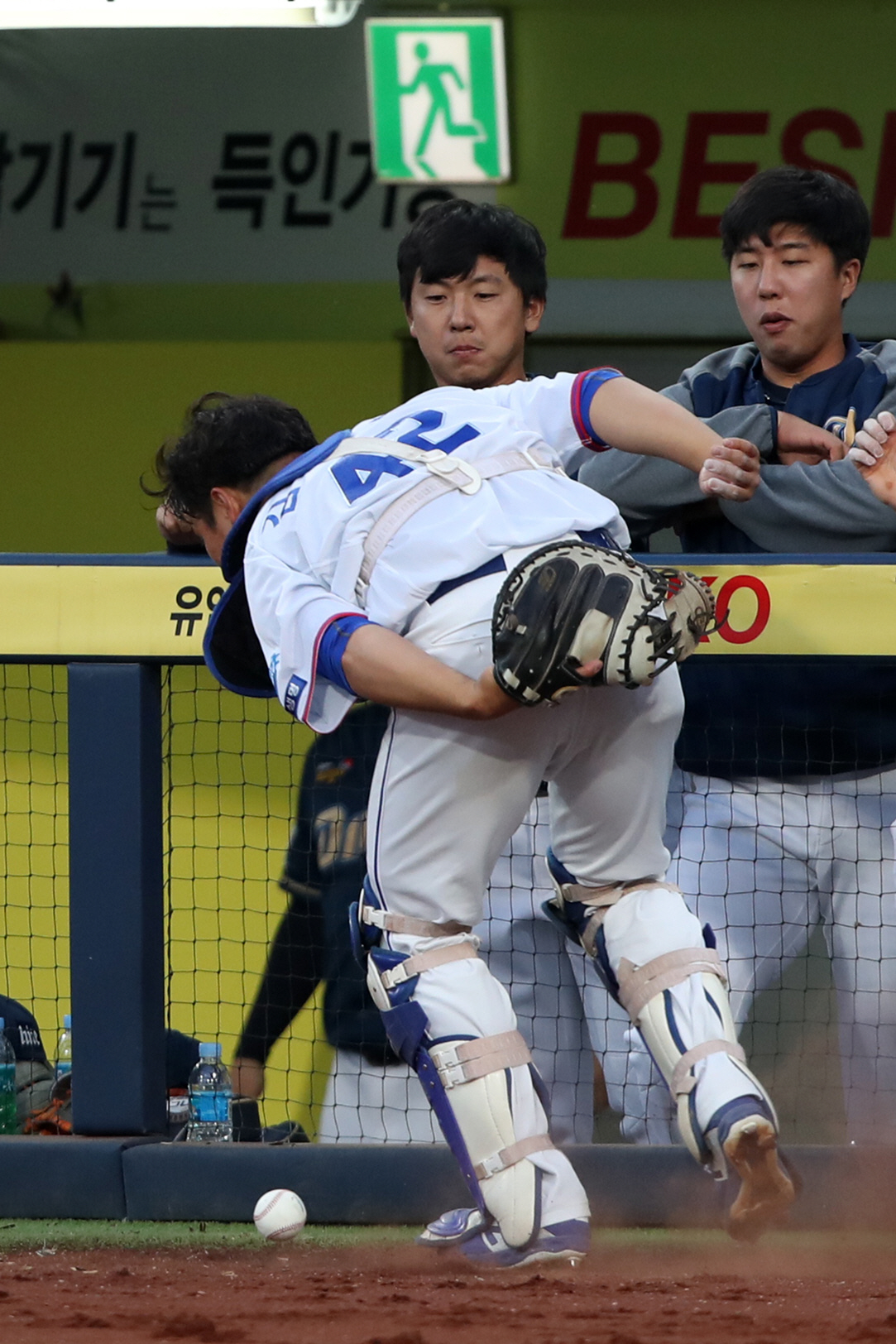 지옥과 천당을 오간 데뷔전이었다. 역시 프로 무대는 만만치 않았다. 2회말 2사 1루에서 맞은 첫 타석에서 김영규에게 헛스윙 삼진으로 물러났다. 수비에서도 진땀을 흘렸다. 0-0으로 팽팽하던 3회초 선두 타자 김성욱의 초구 파울 플라이를 놓치고 말았다. 상대 벤치 앞에서 주춤하며 품에 안듯이 포구하다 미트에 들어갔던 공이 다시 튕겨나오고 말았다. 잡을 수 있었던 공인데다 선두타자여서 부담이 두배. 스스로를 질책하듯 아쉬운 표정으로 홈플레이트로 돌아왔다.