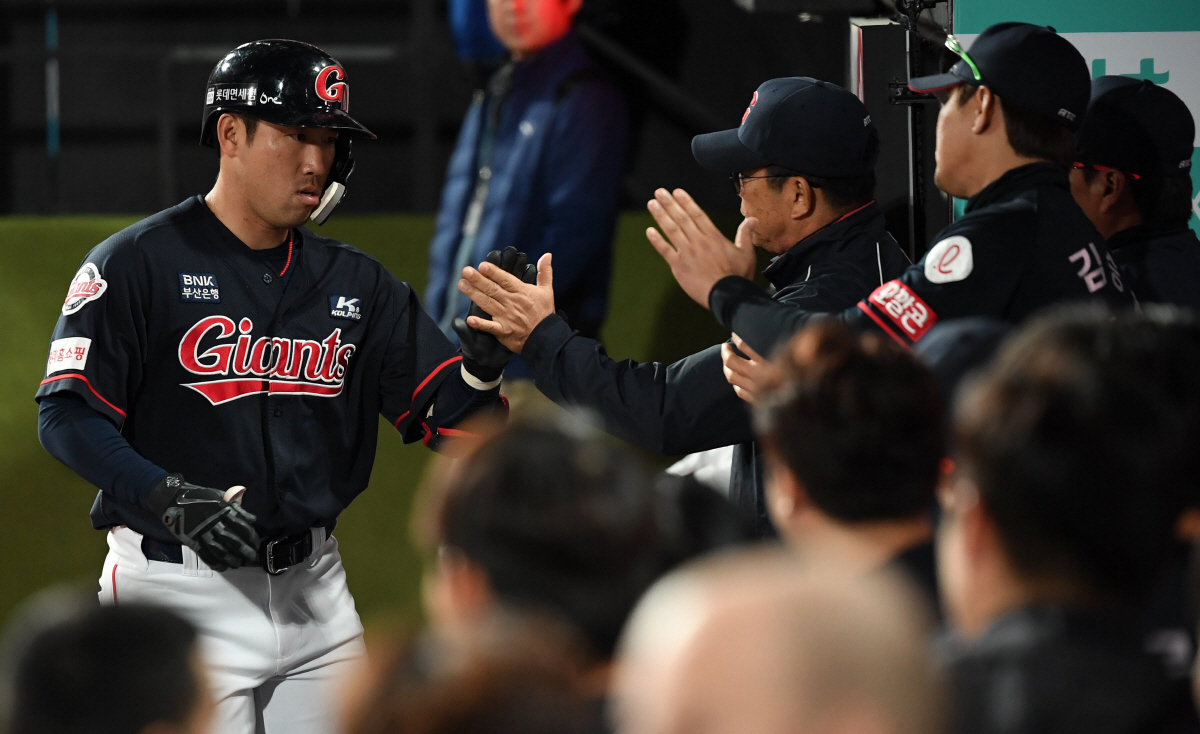 KT 위즈와 롯데 자이언츠의 2019 KBO 리그 주중 3연전 마지막 경기가 9일 수원KT위즈파크에서 열렸다. 4회초 롯데 전준우가 좌중월 솔로홈런을 날리고 양상문 감독과 하이파이브를 하고 있다. 수원=허상욱 기자 wook@sportschosun.com