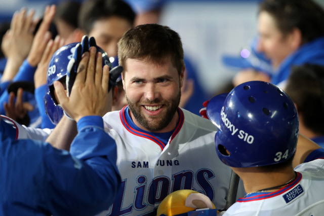 9일 오후 대구 삼성라이온즈파크에서 열린 '2019 신한은행 MY CAR KBO리그' 삼성라이온즈와 NC다이노스의 경기에서 3회말 무사 주자 만루상황에서 삼성라이온즈 4번타자 러프가 좌측 담장을 넘기는 만루 홈런을 치고 덕아웃에서 동료들의 축하를 받고 있다. 사진제공=삼성라이온즈