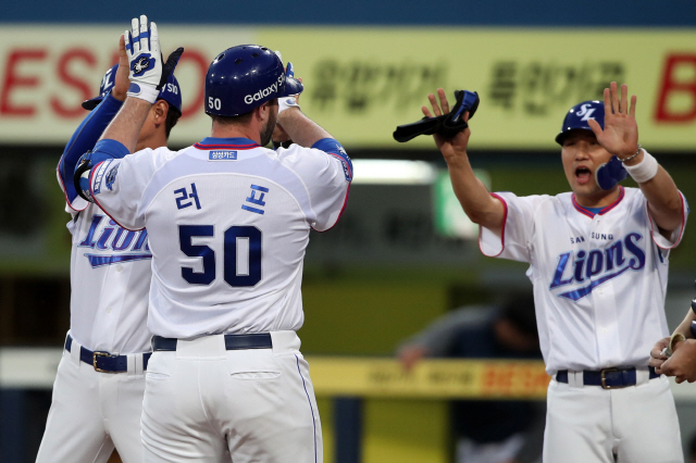 9일 오후 대구 삼성라이온즈파크에서 열린 '2019 신한은행 MY CAR KBO리그' 삼성라이온즈와 NC다이노스의 경기에서 3회말 무사 주자 만루상황에서 삼성라이온즈 4번타자 러프가 좌측 담장을 넘기는 만루 홈런을 치고 홈에서 동료들의 축하를 받고 있다. 사진제공=삼성라이온즈