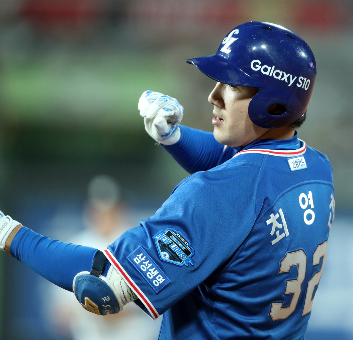 17일 오후 수원 kt위즈파크에서 열린 '2019 신한은행 MY CAR KBO리그' kt위즈와 삼성라이온즈의 경기에서 삼성라이온즈 최영진이 1루타를 치고 세레머니를 하고 있다. 사진제공=삼성라이온즈
