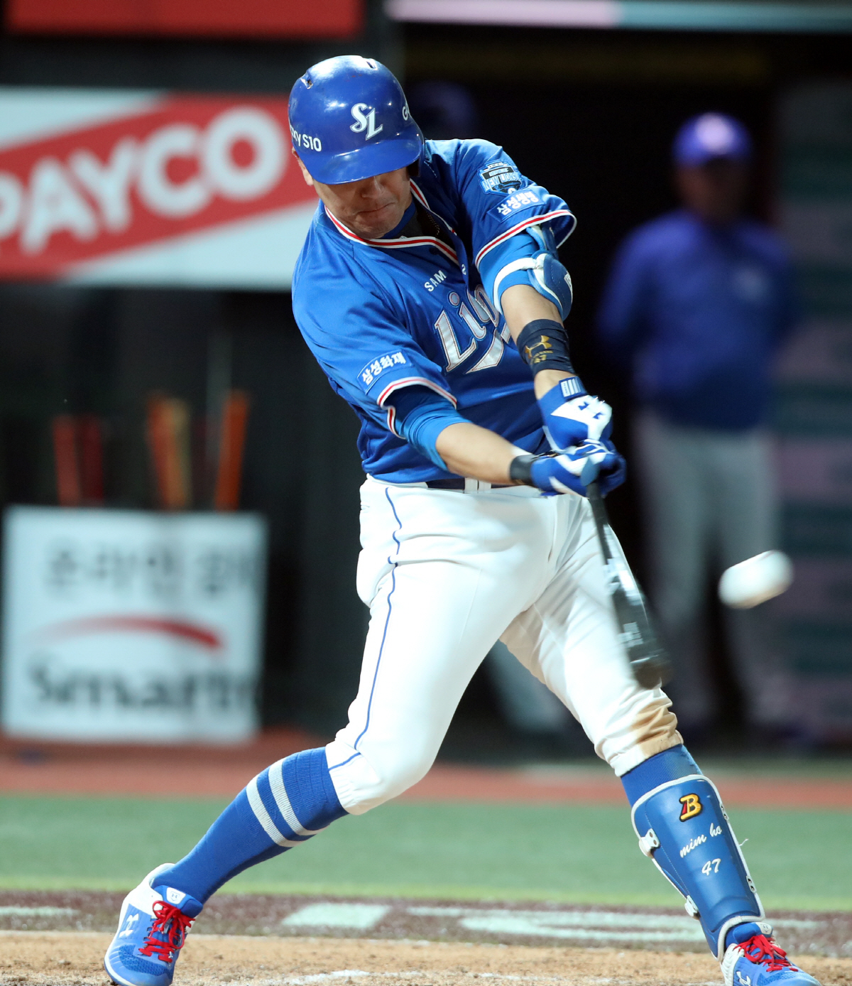 17일 오후 수원 kt위즈파크에서 열린 '2019 신한은행 MY CAR KBO리그' kt위즈와 삼성라이온즈의 경기에서 8회초 삼성라이온즈 강민호가 좌중간 2루타를 치고 있다.사진제공=삼성라이온즈