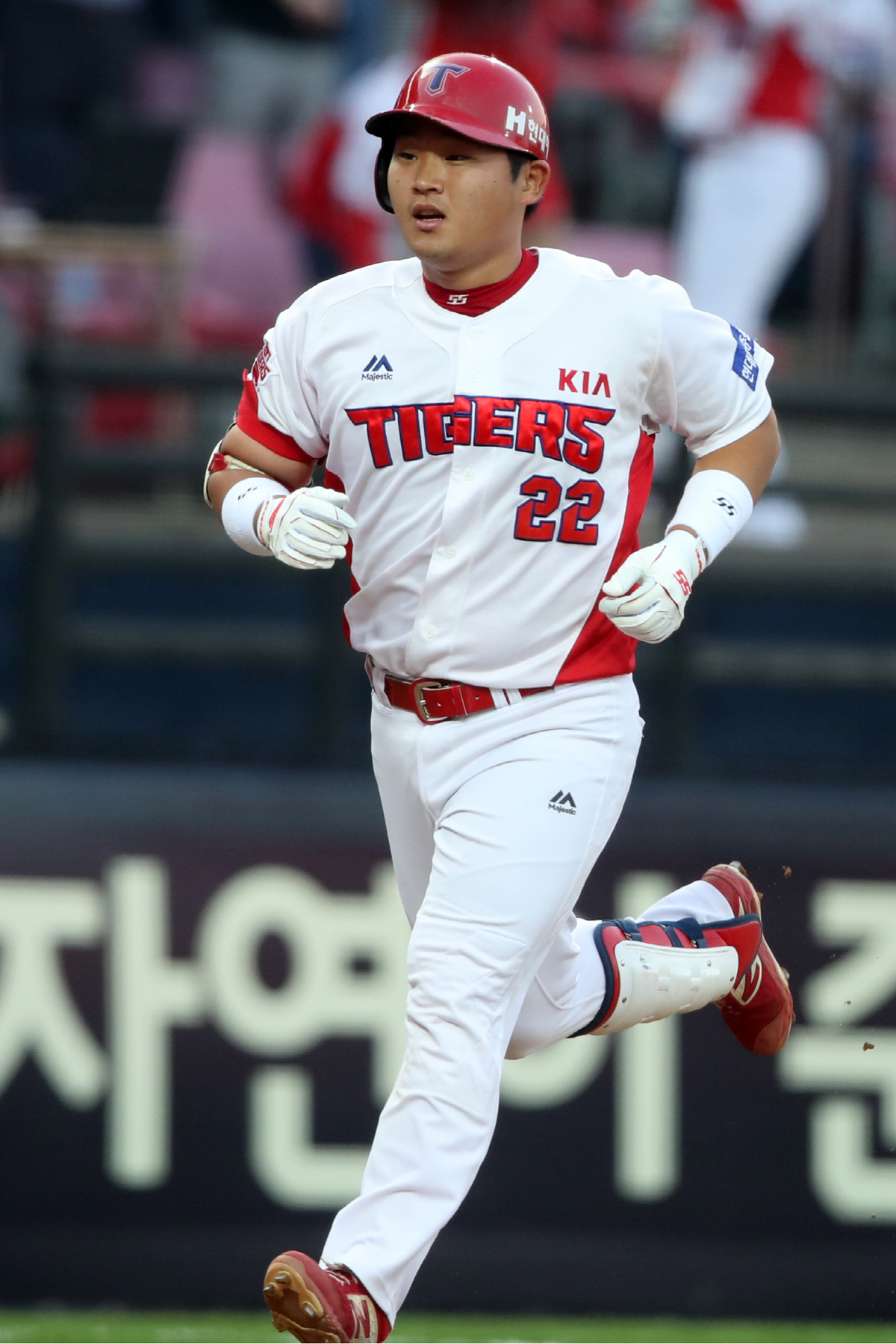 22일 오후 광주 기아챔피언스필드에서 열린 '2019 신한은행 MY CAR KBO리그' KIA타이거즈와 롯데자이언츠의 경기에서 2회말 KIA타이거즈 신범수가 우익수 뒤 투런 역전 홈런을 치고 베이스를 돌고 있다. 사진 제공=KIA 타이거즈