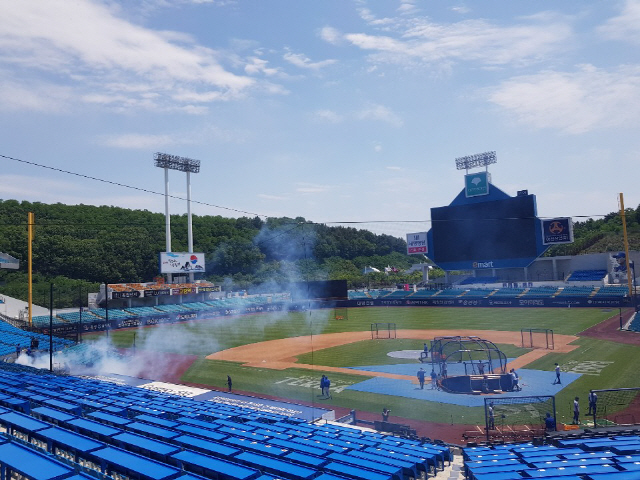 [대구=스포츠조선 정현석 기자]삼성 vs 키움전이 열린 26일 대구 라이온즈파크에는 경기 전 소독 작업이 있었다.