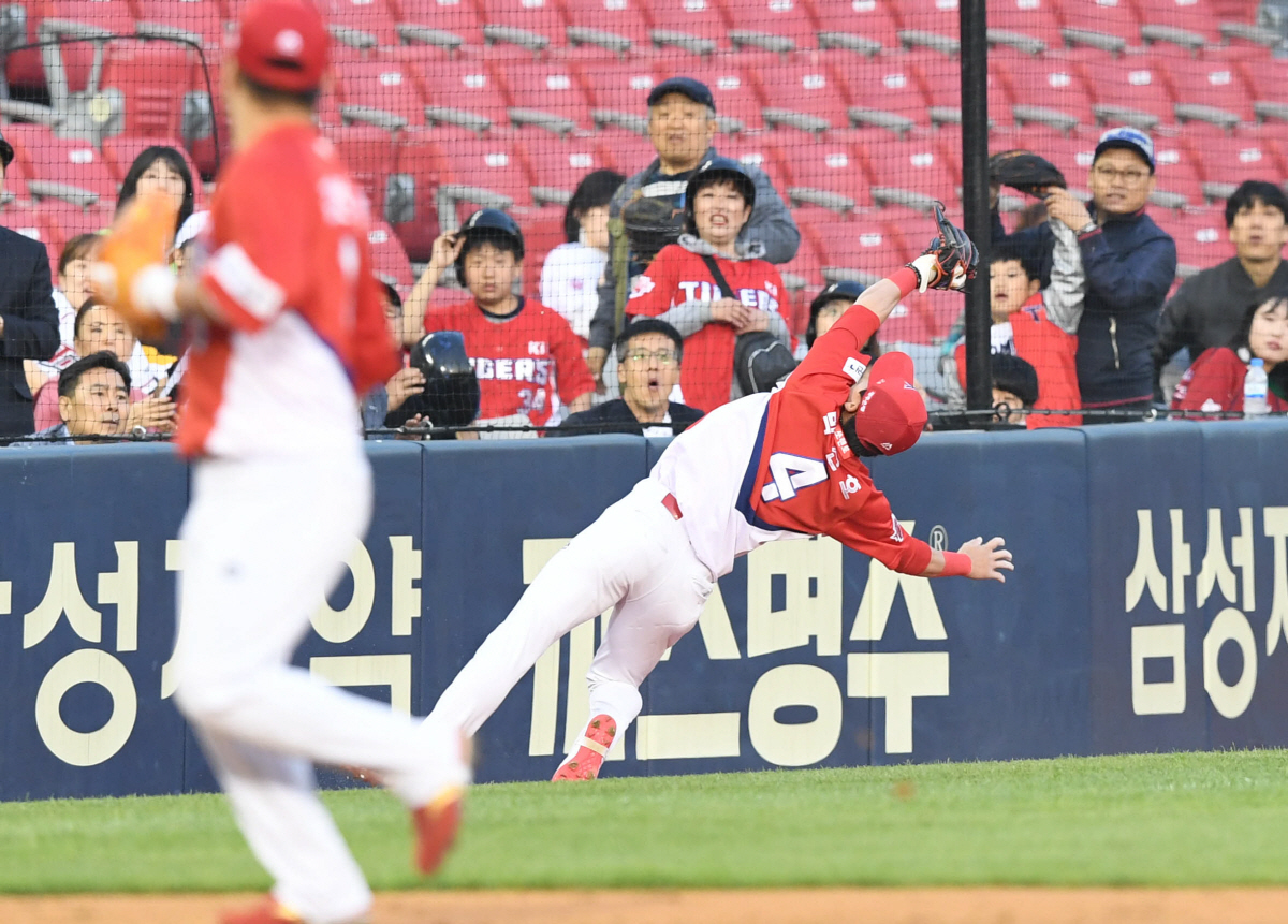 30일 대전 한화생명 이글스파크에서 열린 한화 이글스와의 원정경기. 이날 2번 타자 겸 3루수로 선발출전한 박찬호의 메이저리그급 수비가 나온 건 3-1로 앞선 5회 말이었다. 2사 3루 상황, 적시타를 내주면 1점차로 쫓길 수 있었다. 타석에는 호잉이 들어섰다. 3구를 밀어친 호잉의 타구는 빠르게 3루수 박찬호 쪽으로 날아갔다. 그러나 공중으로 껑충 뛰어오른 박찬호는 라인드라이브성 타구를 잡아냈다. 그리고 주먹을 불끈 쥐는 세리머니를 펼쳤다.