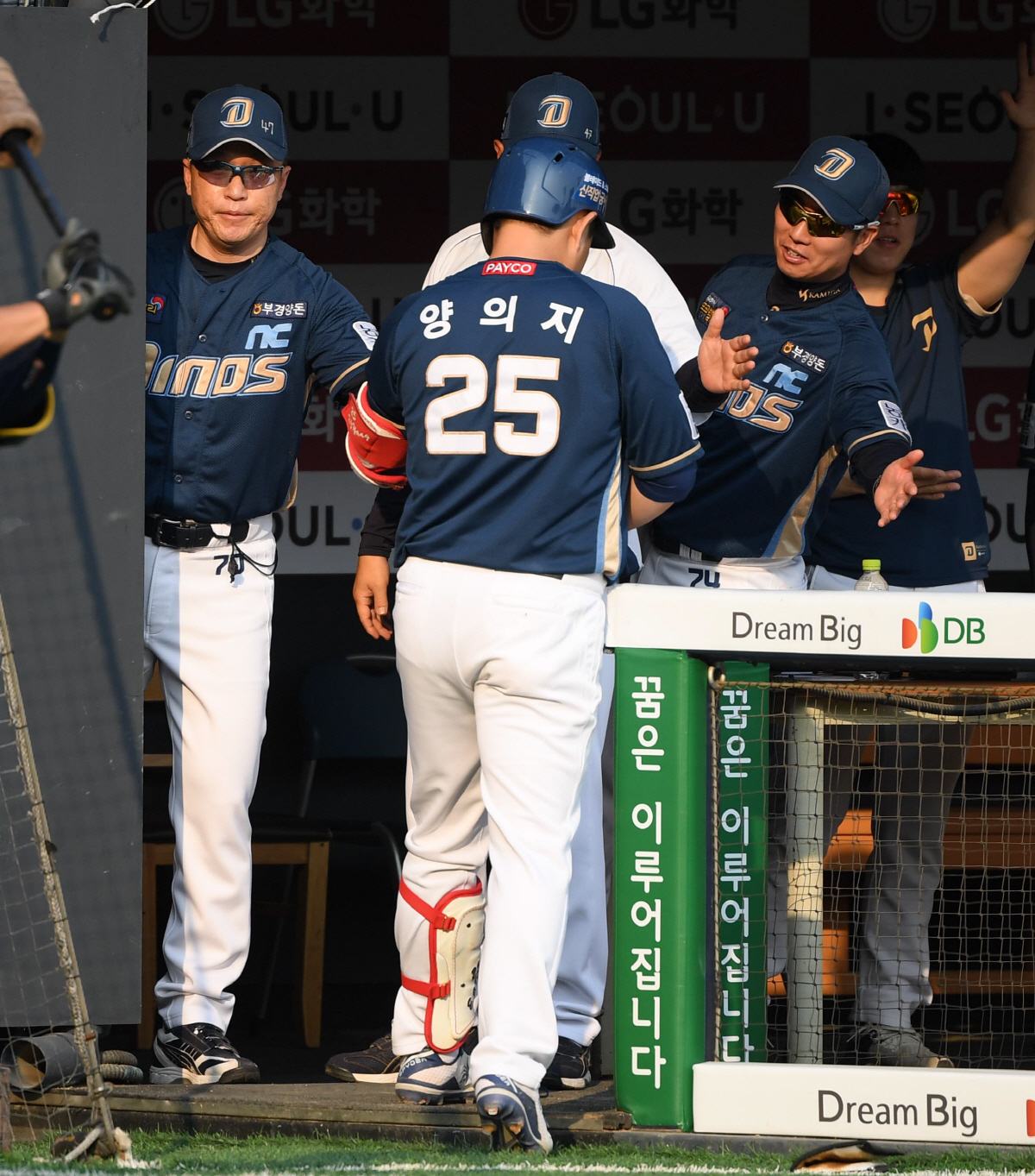 LG 트윈스와 NC 다이노스의 2019 KBO 리그 주말 3연전 마지막 경기가 2일 잠실구장에서 열렸다. 3회초 NC 양의지가 좌월 솔로홈런을 날리고 이동욱 감독과 기쁨을 나누고 있다. 잠실=허상욱 기자 wook@sportschosun.com