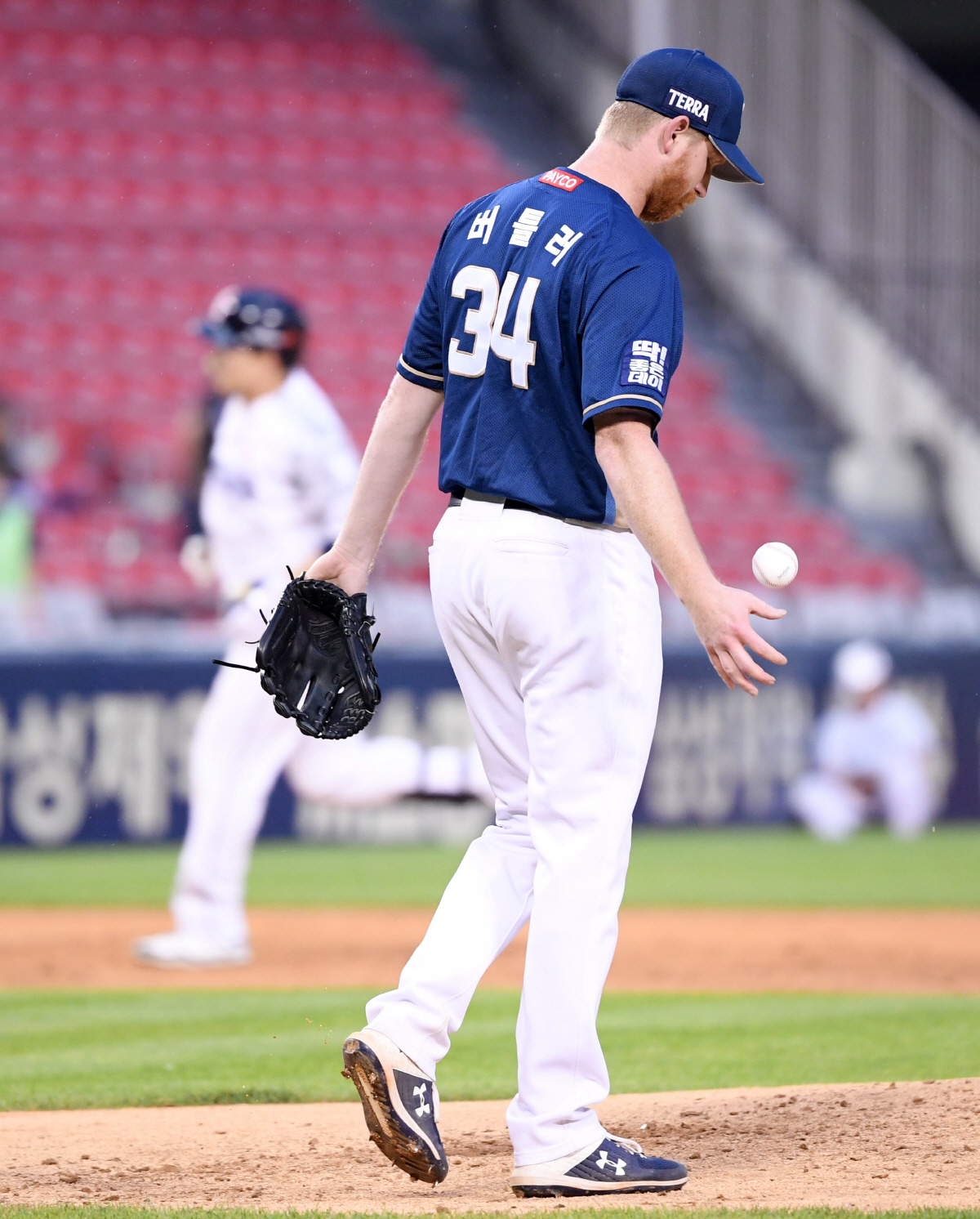 두산 베어스와 NC 다이노스의 2019 KBO 리그 경기가 18일 잠실구장에서 열렸다. 3회말 두산 오재일이 우월 솔로홈런을 날렸다. 홈런을 허용한 NC 버틀러가 아쉬워하고 있다. 잠실=허상욱 기자 wook@sportschosun.com