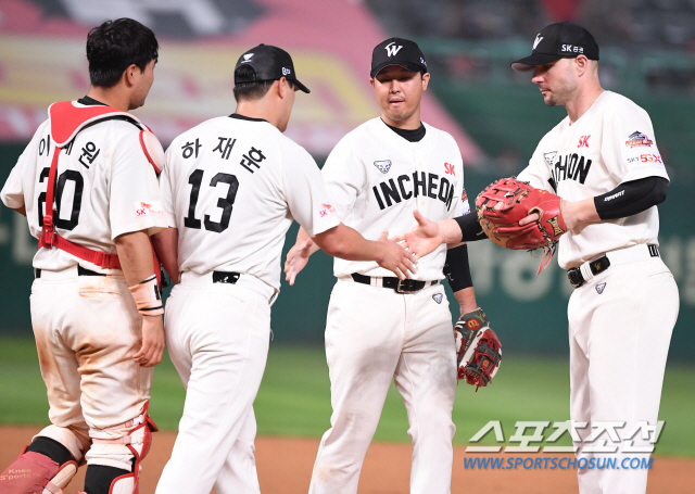 | 14일 인천 SK행복드림구장에서 KBO리그 SK 와이번스와 키움 히어로즈의 경기가 열렸다. SK가 키움에 승리하며 위닝시리즈를 달성했다. 경기 종료 후 하이파이브를 나누고 있는 SK 선수들. 인천=송정헌 기자 songs@sportschosun.com/2019.07.14/ |