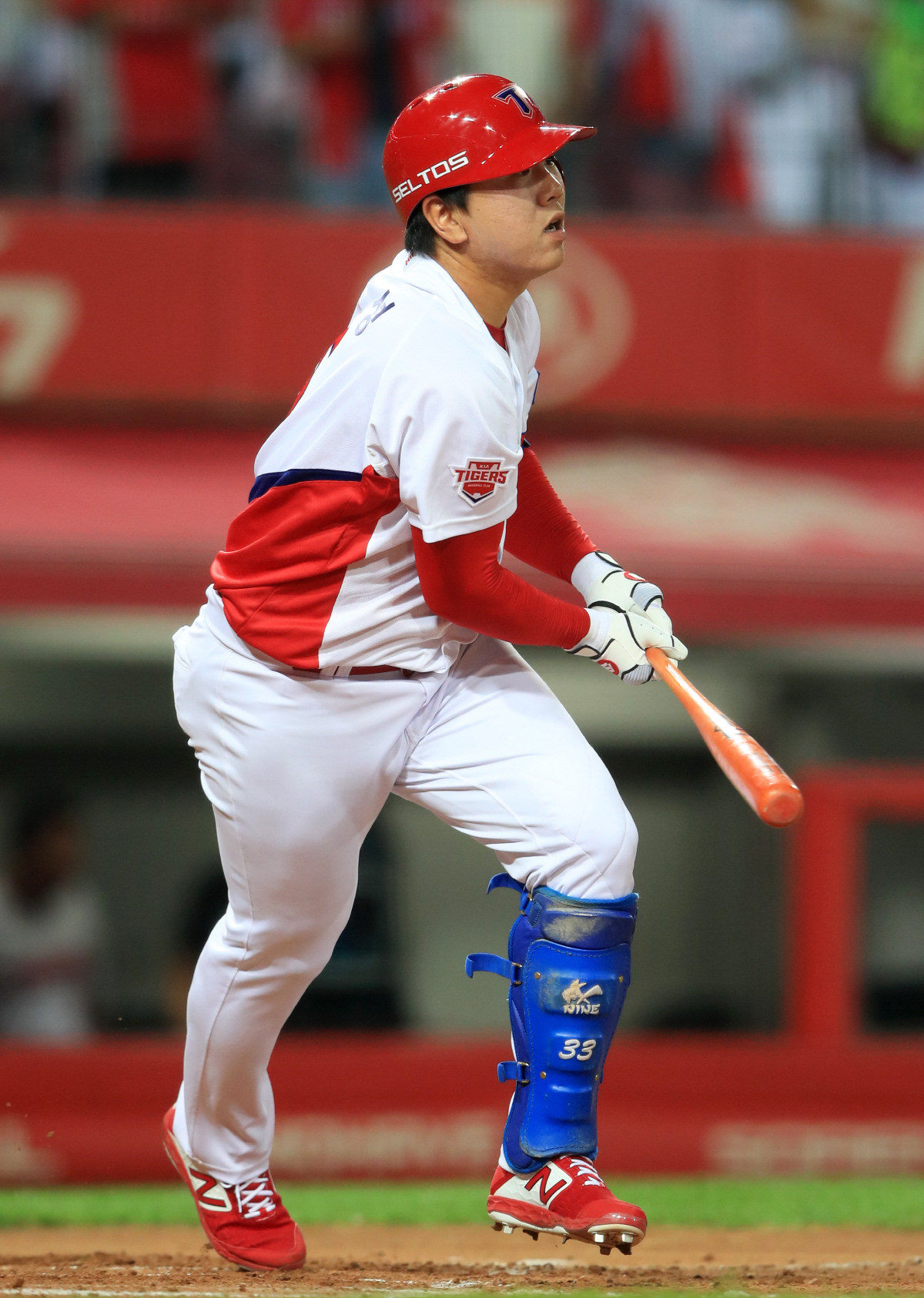 [광주=스포츠조선 김진회 기자] KIA 타이거즈의 우타 거포 이우성이 경기 도중 사구로 교체됐다.