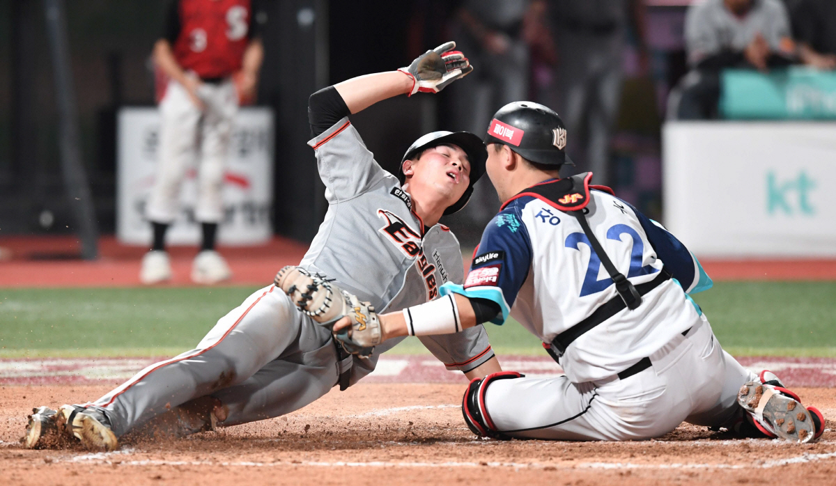 2019 KBO리그 한화이글스와 KT위즈의 경기가 30일 수원KT위즈파크에서 열렸다. 한화 유장혁이 8회초 2사 1루에서 장진혁의 중전안타때 홈에서 태그 아웃되고 있다. 수원=최문영 기자 deer@sportschosun.com /2019.07.30/