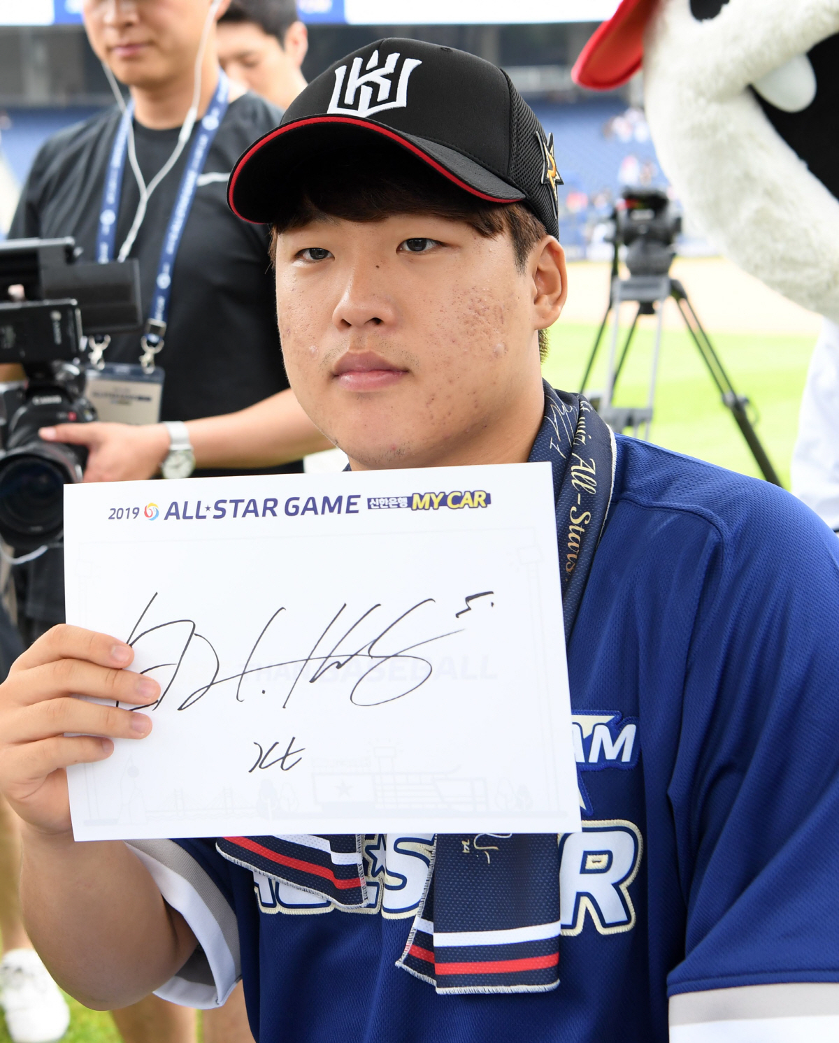 2019 KBO 올스타전이 21일 창원NC파크에서 열렸다. 드림 올스타(삼성, 두산, 롯데, SK)와 나눔 올스타(LG, 키움, NC, KIA, 한화)로 대결을 펼친다. 경기 전 올스타 선수들이 팬과 함께하는 사인회를 가졌다. 사인과 함께 포즈를 취한 KT 강백호의 모습. 창원=허상욱 기자 wook@sportschosun.com/2019.07.21/