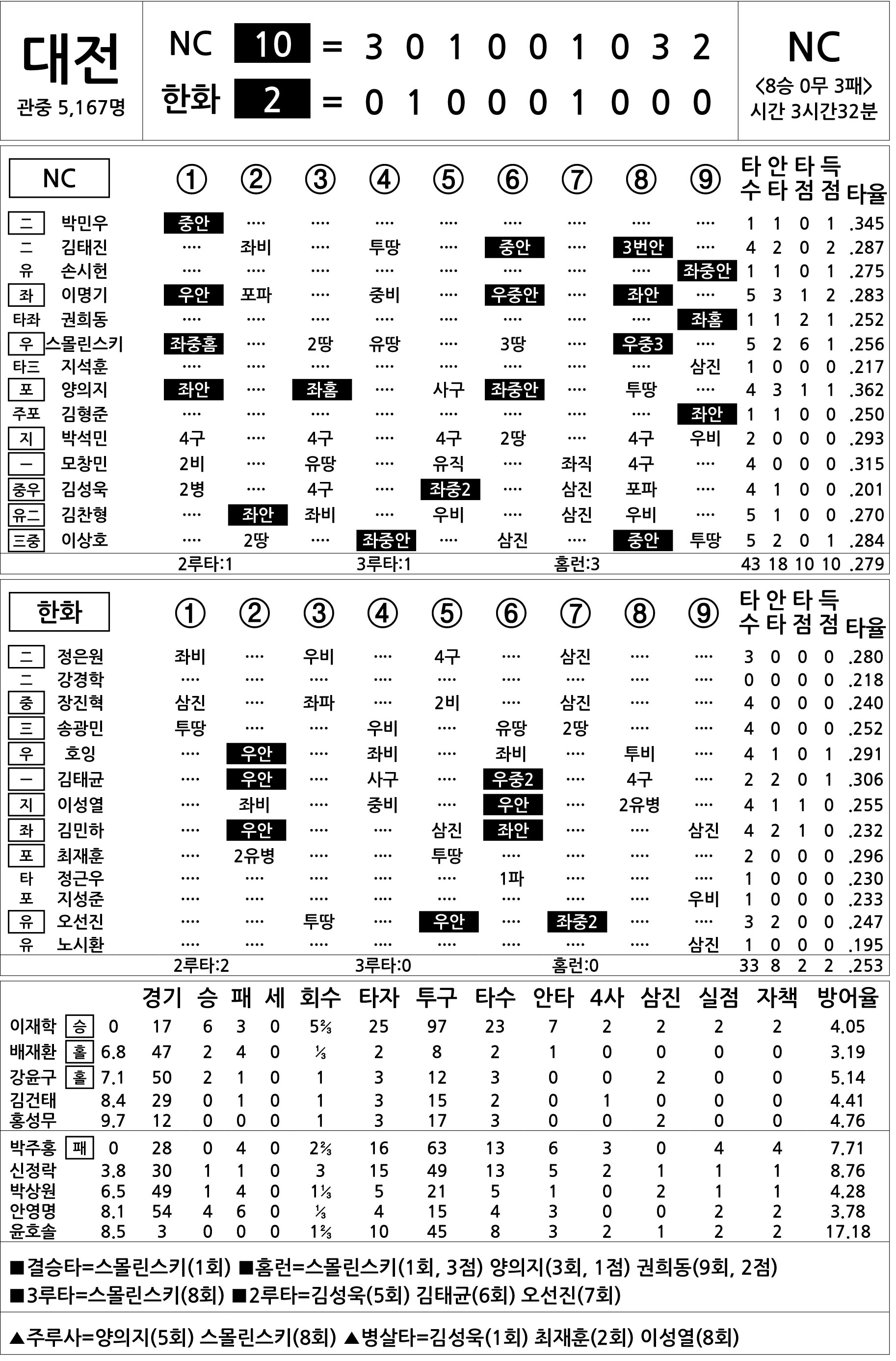 [2019 KBO리그 기록실] NC vs 한화 (8월 13일)