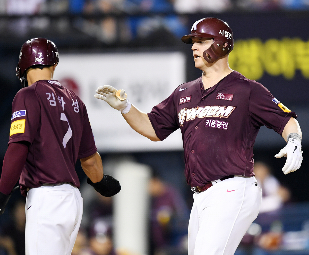 2019 KBO리그 키움 히어로즈와 LG 트윈스의 경기가 13일 잠실구장에서 열렸다. 5회초 1사 1루 키움 샌즈가 역전 투런포를 치고 들어오며 축하받고 있다. 잠실=정재근 기자 cjg@sportschosun.com/2019.08.13/