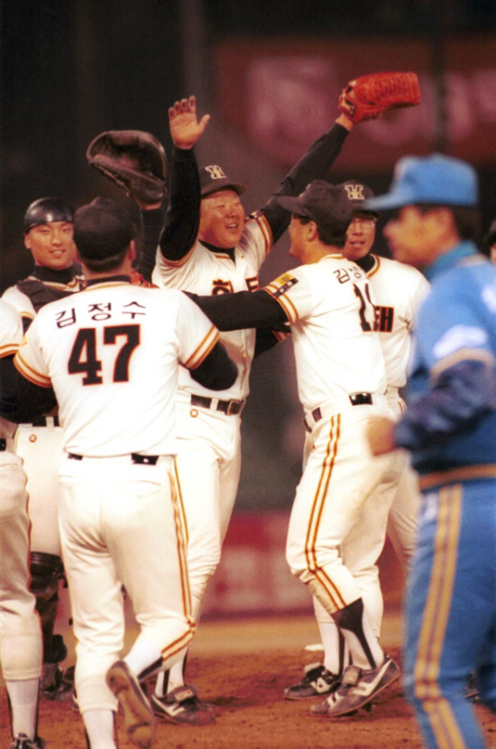 1993년 삼성을 4승2패로 꺾고 우승한 해태 선수들. 해태와 삼성은 이후 한국시리즈에서 만나지 못했다. 스포츠조선DB