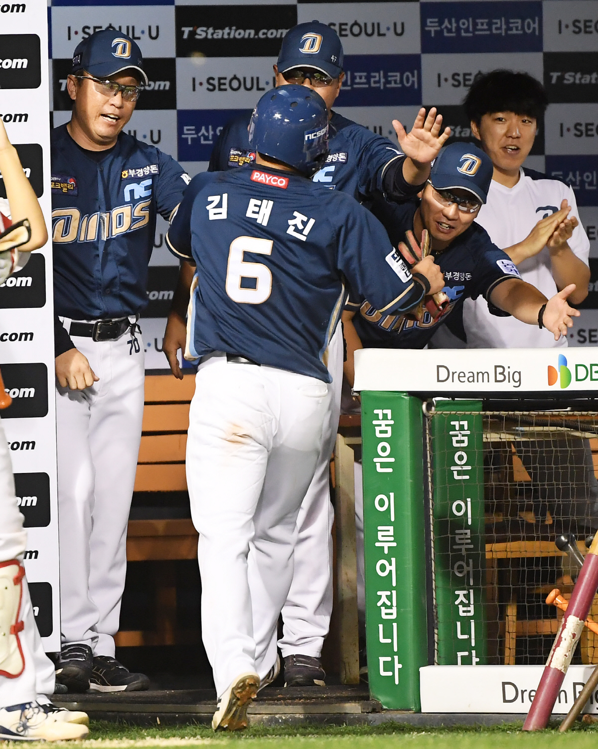 2019 KBO리그 두산 베어스와 NC 다이노스의 경기가 11일 오후 서울 잠실야구장에서 열렸다. 5회초 2사 1,2루 NC 박민우의 안타때 2루 주자 김태진이 홈을 밟은 뒤 이동욱 감독과 하이파이브를 하고 있다. 잠실=박재만 기자 pjm@sportschosun.com/2019.09.11/