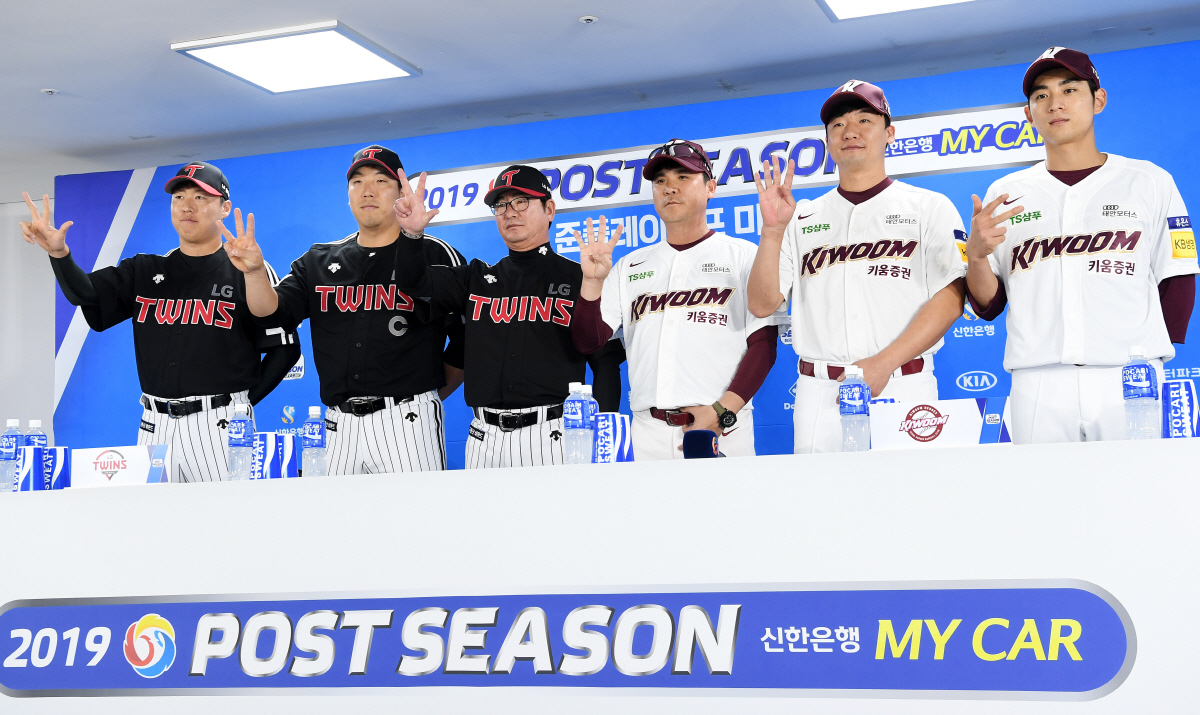 2019 KBO리그 LG와 키움의 준플레이오프 미디어데이가 5일 오후 고척스카이돔에서 열렸다. LG 차우찬, 김현수, 류중일 감독, 키움 장정석 감독, 오주원, 이정후(왼쪽부터)가 '몇 차전에서 경기가 끝날 것인가'라는 질문에 손가락을 펴 답하고 있다. 정재근 기자 cjg@sportschosun.com