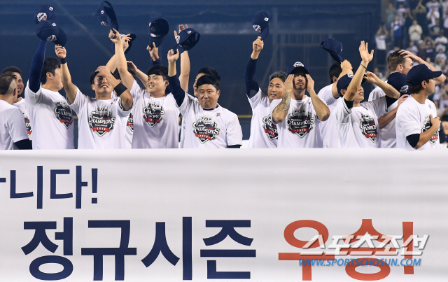 1일 서울 잠실야구장에서 KBO리그 두산 베어스와 NC 다이노스의 경기가 열렸다. 두산이 NC에 6대 5로 역전승을 거두며 2019 시즌 우승을 확정지었다. 팬들이 지켜보는 가운데 우승 세리머니를 펼치고 있는 두산 선수들. 잠실=송정헌 기자 songs@sportschosun.com/2019.10.01/