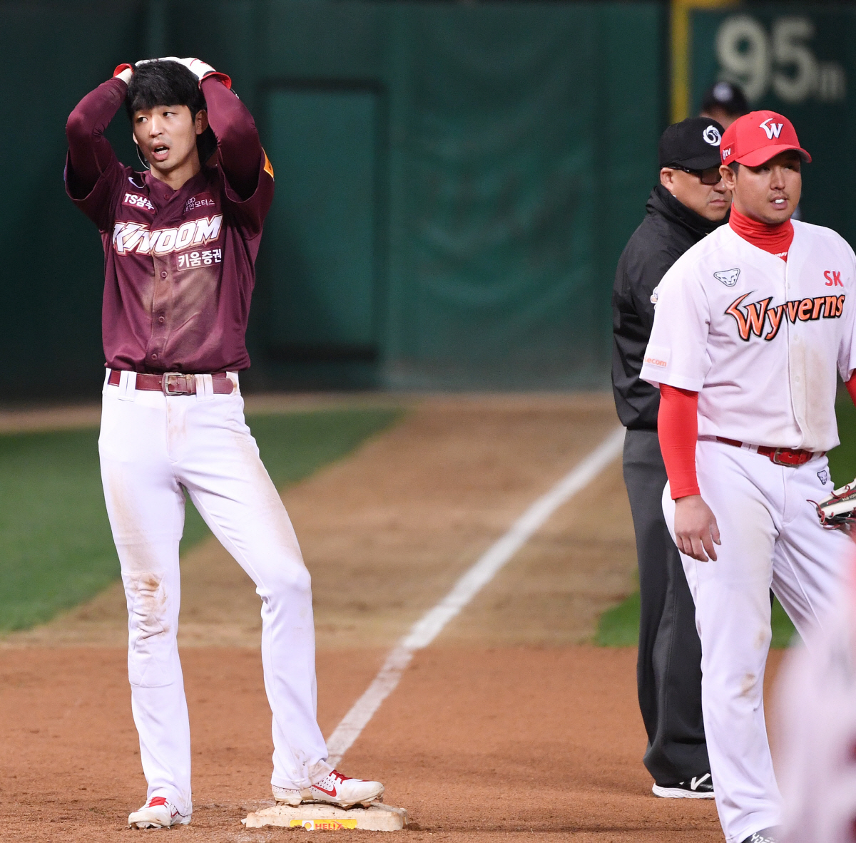 2019 KBO리그 키움과 SK의 플레이오프 2차전이 15일 오후 인천 SK행복드림구장에서 열렸다. 8회초 1사 2, 3루 키움 이지영의 안타 때 주루미스로 3루에 머문 김규민이 아쉬워하고 있다. 인천=정재근 기자 cjg@sportschosun.com/2019.10.15/