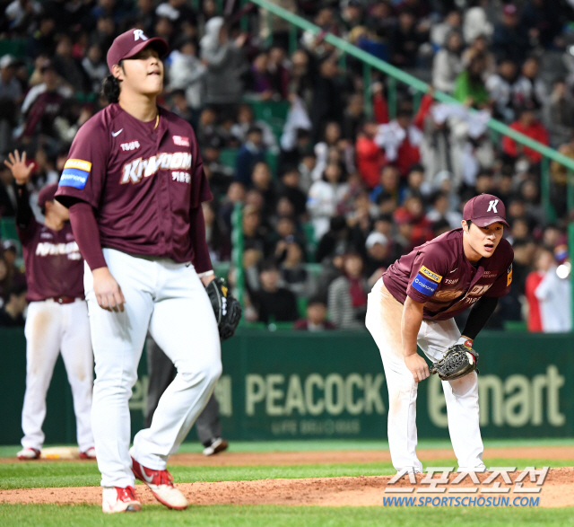 2019 KBO리그 키움과 SK의 플레이오프 2차전이 15일 오후 인천 SK행복드림구장에서 열렸다. 7회말 무사 2,3루 키움 유격수 김하성과 조상우가 SK 김강민의 타구를 잡아 아웃처리 했지만 재역전을 허용하며 아쉬워하고 있다. 인천=허상욱 기자 wook@sportschosun.com/2019.10.15/