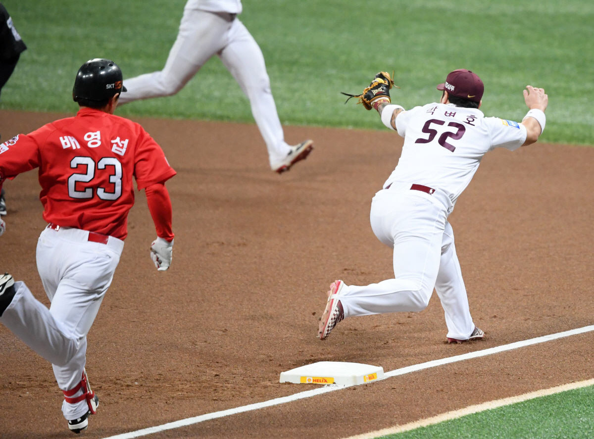 키움 히어로즈와 SK 와이번스의 2019 KBO 리그 플레이오프 3차전이 17일 고척스카이돔에서 열렸다. 1회초 SK 배영섭이 내야땅볼을 치고 키움 유격수 김하성의 송구실책으로 세이프되고 있다. 고척돔=허상욱 기자 wook@sportschosun.com/2019.10.17/