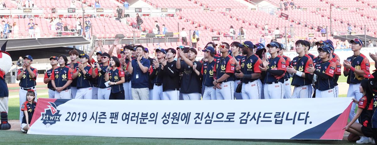 KT 위즈와 삼성 라이온즈의 2019 KBO 리그 경기가 29일 수원 KT위즈파크에서 열렸다. KT가 7대0으로 승리하며 71승(71패 2무)을 기록해 창단 첫 5할 승률로 시즌을 마쳤다. 경기 종료 후 이숭용 KT 단장과 이강철 감독, 선수단이 팬들에게 감사의 인사를 전하고 있다. 수원=허상욱 기자 wook@sportschosun.com