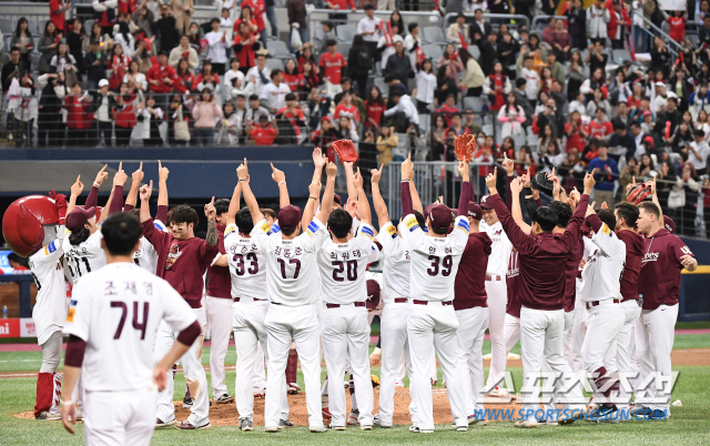 2019 KBO리그 키움과 SK의 플레이오프 3차전이 17일 고척스카이돔에서 열렸다. 키움이 SK에 승리하며 한국시리즈에 진출했다. 경기 종료 후 기뻐하고 있는 키움 선수들. 고척=송정헌 기자 songs@sportschosun.com/2019.10.17/