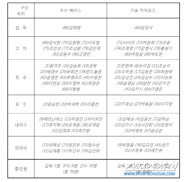 두산 베어스와 키움 히어로즈는 21일 한국시리즈에 출전할 선수 명단을 공개했다. 정규시즌과 비교해 큰 변화는 없었다.