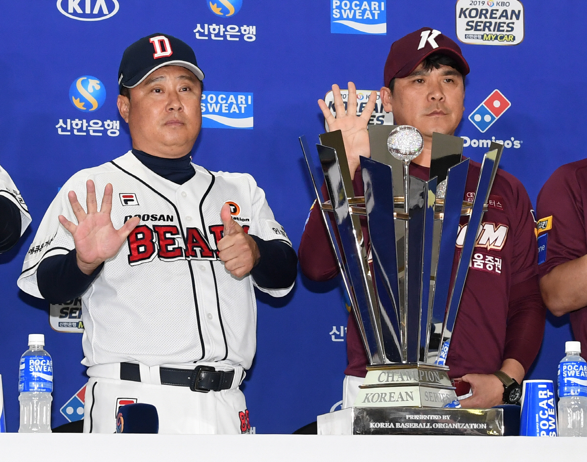 2019 한국시리즈 미디어데이가 21일 잠실구장에서 열렸다. 한국시리즈 미디어데이에는 정규시즌 1위인 두산 베어스 김태형 감독과 오재일, 이영하, 한국시리즈에 진출한 키움 히어로즈 장정석 감독과 이지영, 이정후가 참석했다. 몇차전 승부를 예상하느냐는 질문에 손가락을 들어올리며 포즈를 취하는 양팀 감독과 선수들의 모습. 잠실=허상욱 기자 wook@sportschosun.com