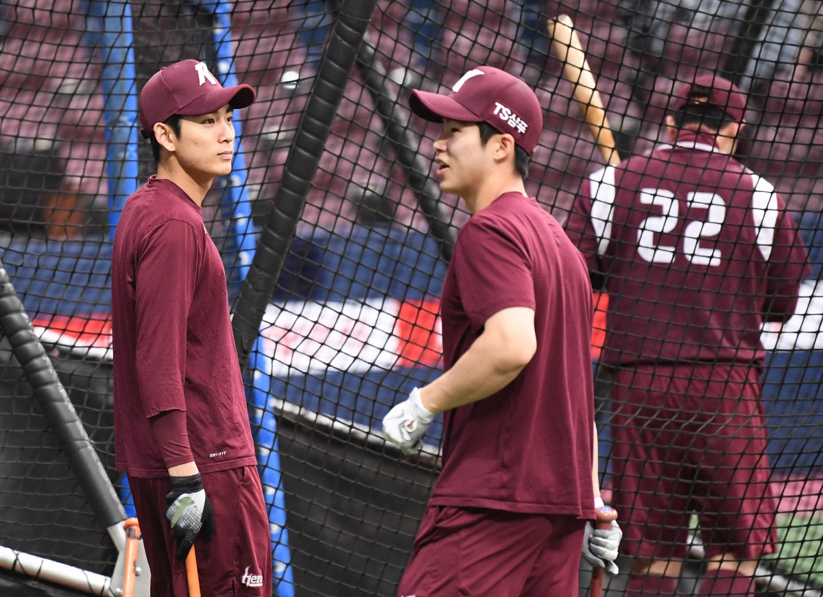 | 26일 서울 고척스카이돔에서 한국시리즈 4차전 키움과 두산의 경기가 열린다. 경기 전 키움 선수들이 훈련에 임하고 있다. 타격훈련을 하고 있는 이정후, 김혜성. 고척=송정헌 기자 songs@sportschosun.com/2019.10.26/ |