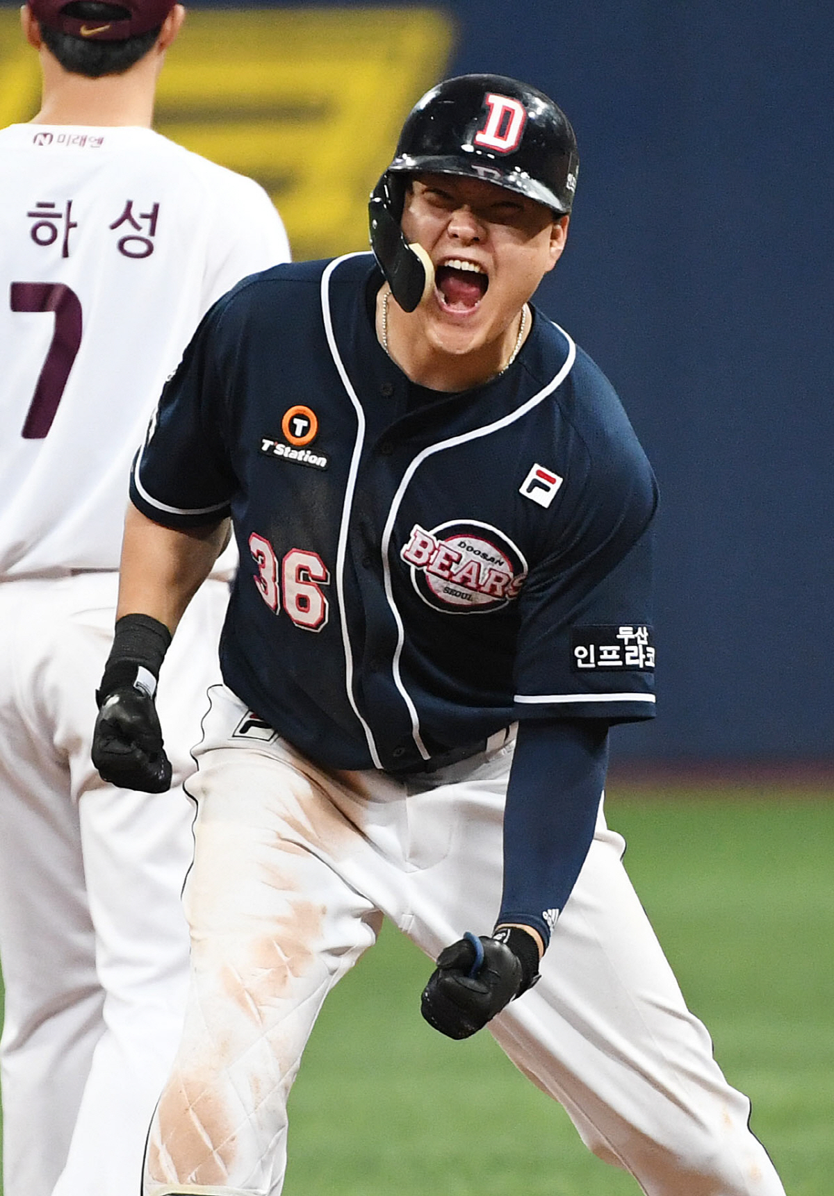 2019 KBO리그 두산과 키움의 한국시리즈 4차전이 26일 오후 고척스카이돔에서 열렸다. 10회초 2사 3루 두산 오재일이 1타점 2루타를 치고 나가 환호하고 있다. 고척=정재근 기자 cjg@sportschosun.com/2019.10.26/