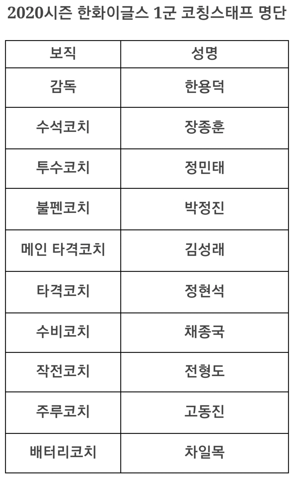 한화는 31일 한화 1군 코치진을 확정했다. 한용덕 감독을 비롯한 장종훈 수석코치, 정민태 투수코치, 전형도 작전코치, 채종국 수비코치, 고동진 주루코치 등은 내년 시즌에도 동일한 보직으로 1군을 지도한다.