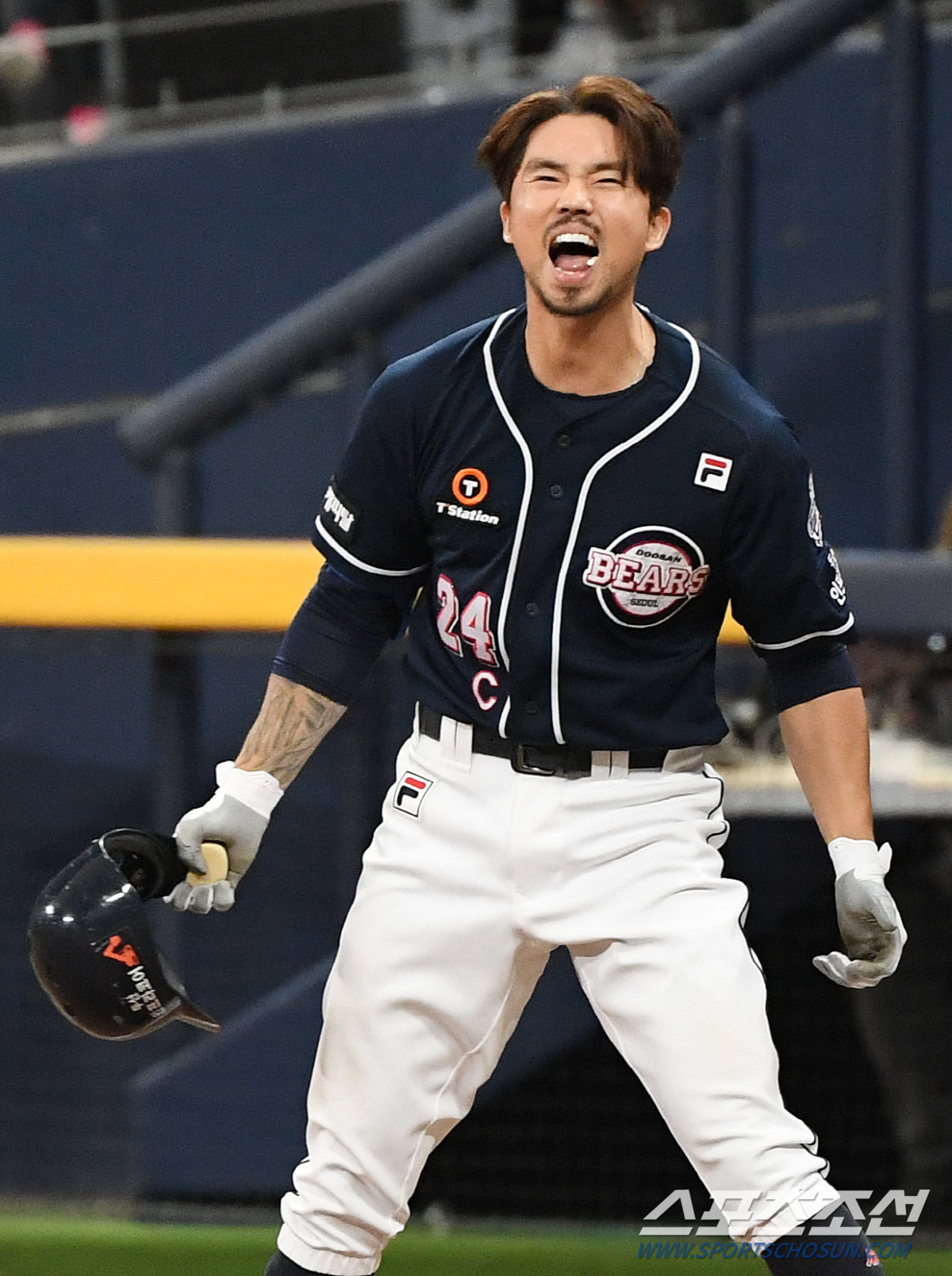 2019 KBO리그 두산과 키움의 한국시리즈 4차전이 26일 오후 고척스카이돔에서 열렸다. 5회초 2사 만루 두산 오재원이 2타점 역전 적시타를 치고 나가 환호하고 있다. 고척=정재근 기자 cjg@sportschosun.com/2019.10.26/