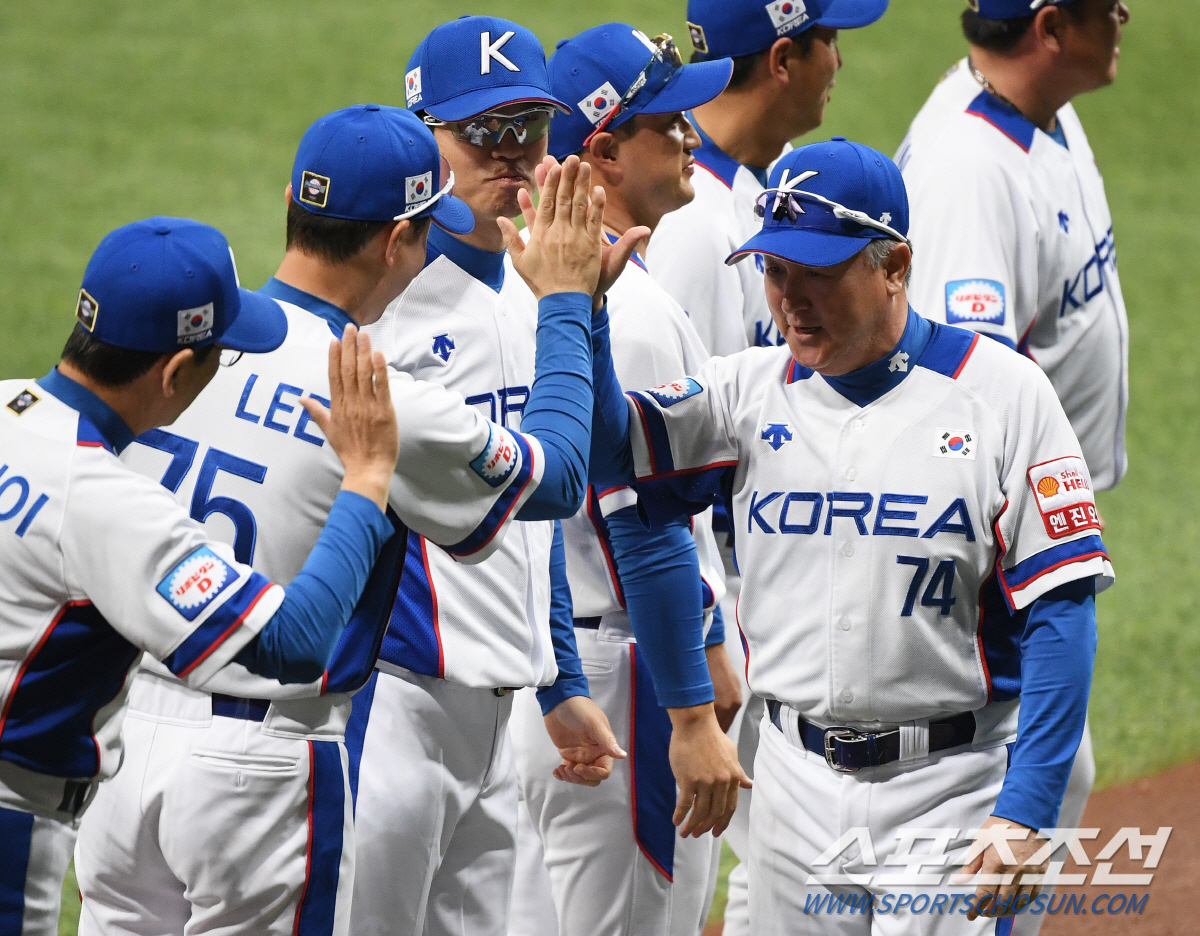 2019 WBSC 프리미어 12 서울 예선 라운드 대한민국과 쿠바의 경기가 8일 서울 고척스카이돔에서 열렸다. 김경문 감독이 그라운드로 나오며 코치들과 하이파이브를 하고 있다. 고척=정재근 기자 cjg@sportschosun.com/2019.11.07/