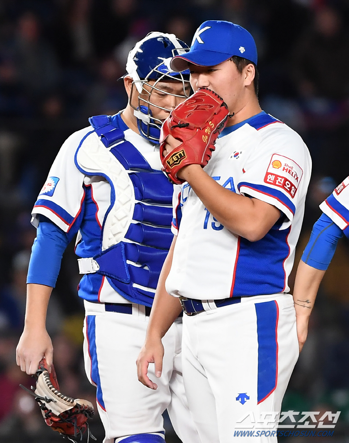 두번째 투수로 등판해 투구를 이어가던 고우석이 7회초 선두타자 후진룽에게 볼넷을 내주고, 다음 타자 린저쉬엔에게 2구 연속 볼이 들어가자 김경문 감독이 직접 나와 투수를 교체했다. 김경문 감독은 원종현을 마운드에 올렸다.