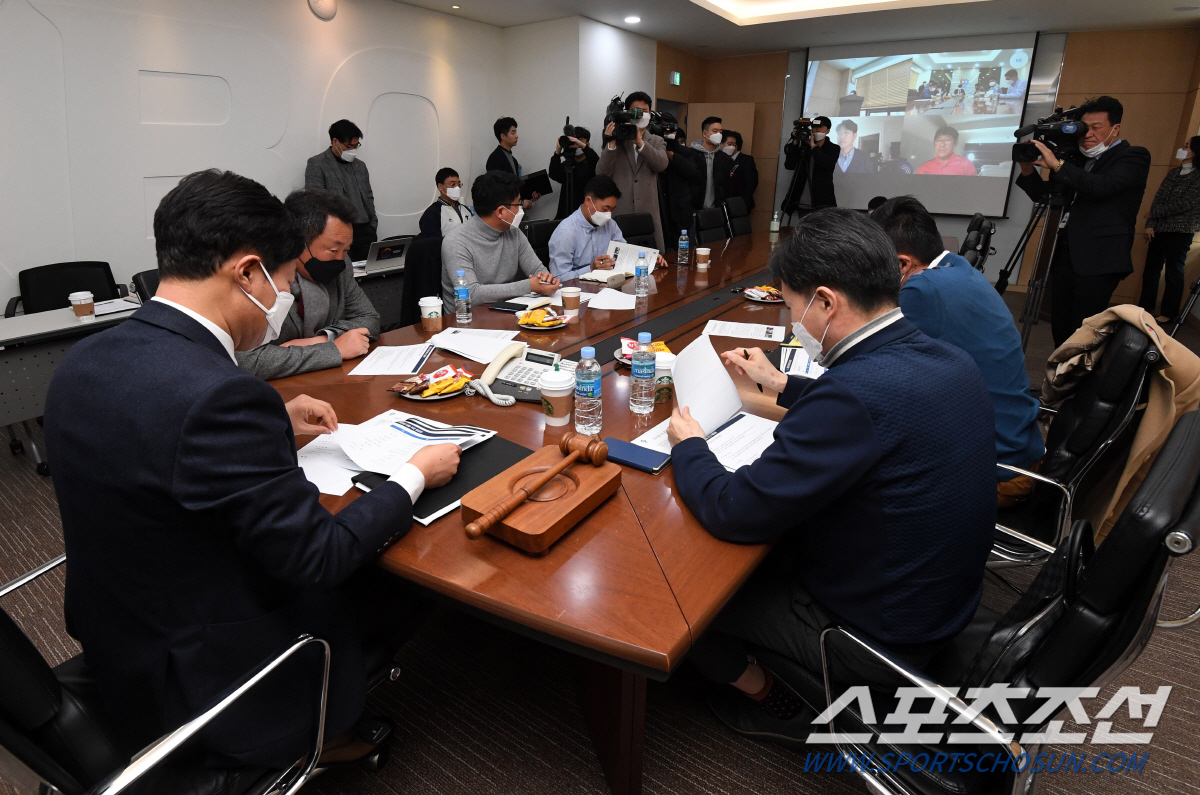 '코로나19' 사태가 장기화됨에 따라 시즌 개막을 앞둔 KBO리그의 개막 연기 가능성이 높아진 가운데 3일 서울 도곡동 KBO 야구회관에서 KBO 10개 구단 단장들이 참가한 긴급 실행위원회가 열렸다. 류대환 사무총장의 주재로 회의가 진행되고 있다. 도곡동=허상욱 기자 wook@sportschosun.com/2020.03.03/