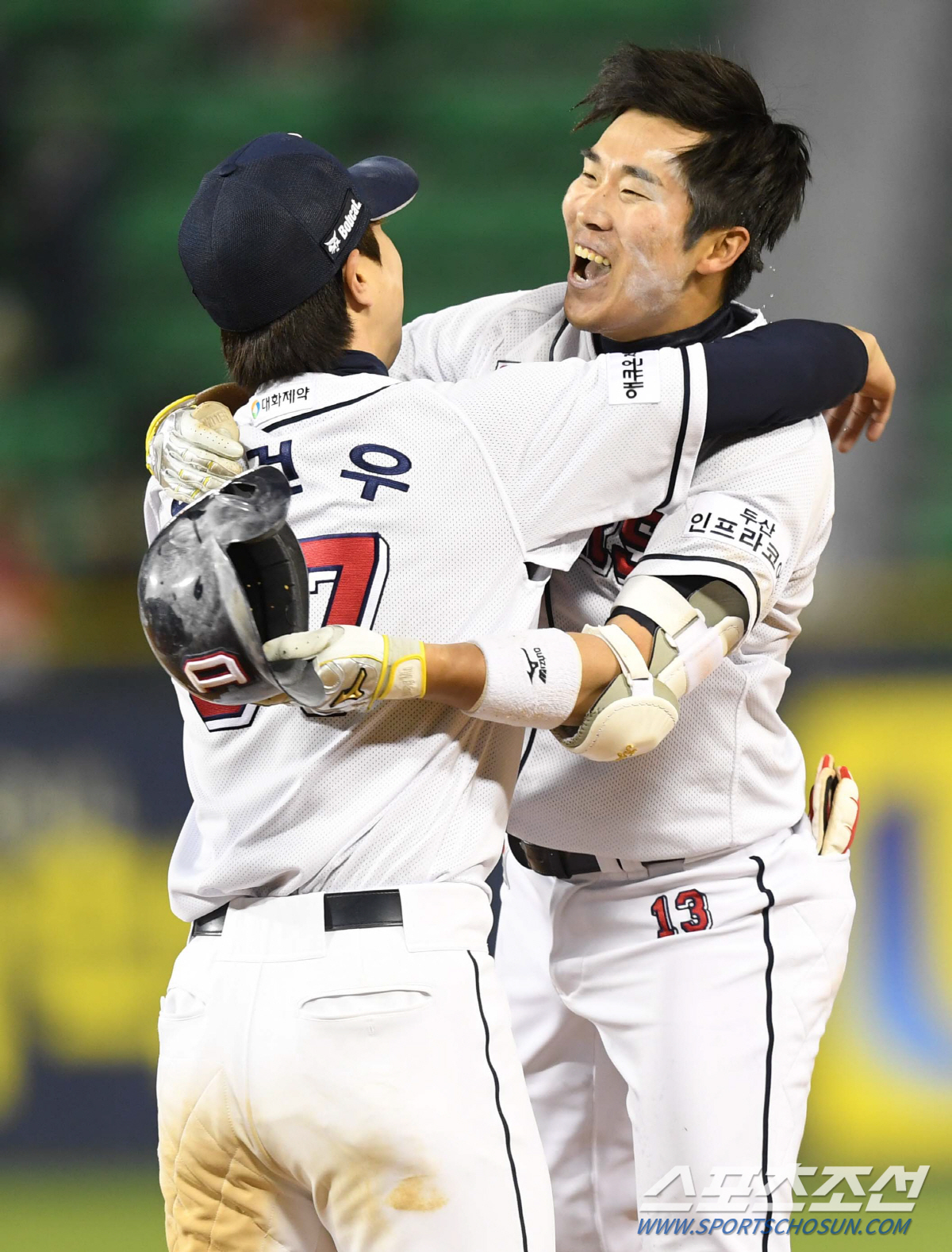2019 KBO 한국시리즈 2차전 두산베어스와 키움히어로즈의 경기- 9회말 1사 2루 두산 박건우가 끝내기 안타를 날린 뒤 환호하고 있다.
