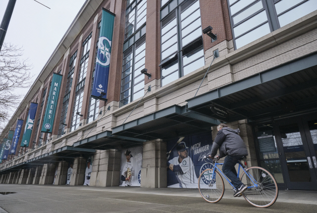 시애틀 매리너스의 홈구장 T-모바일파크 앞을 한 시민이 자전거를 타고 지나가고 있다. 코로나19 확산을 막기 위해 워싱턴주는 시민들이 모이는 대형 행사를 금지한다는 조치를 취했다. 이로 인해 메이저리그 등 해당지역 프로스포츠 구단들의 일정에 직접적인 영향을 미치게 됐다. AP연합뉴스