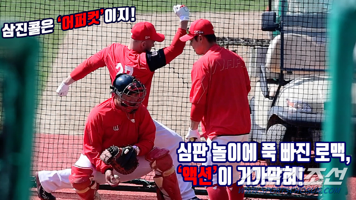 배팅 훈련을 마친 로맥과 김성현, 윤석민이 안방마님 이재원의 훈련을 도왔다. 공을 받는 이재원 옆에서 타격 자세를 취하며 이재원의 포구 훈련을 도운 것. 김성현과 로맥은 한 술 더 떠 심판으로 업종 변경을 했다. 진지하게 볼 판정을 내리며 즐거워하는 모습이 웃음을 자아냈다. 카리스마 넘치는 심판으로 변신한 로맥의 멋진 삼진콜을 감상해보자. 인천=정재근 기자 cjg@sportschosun.com