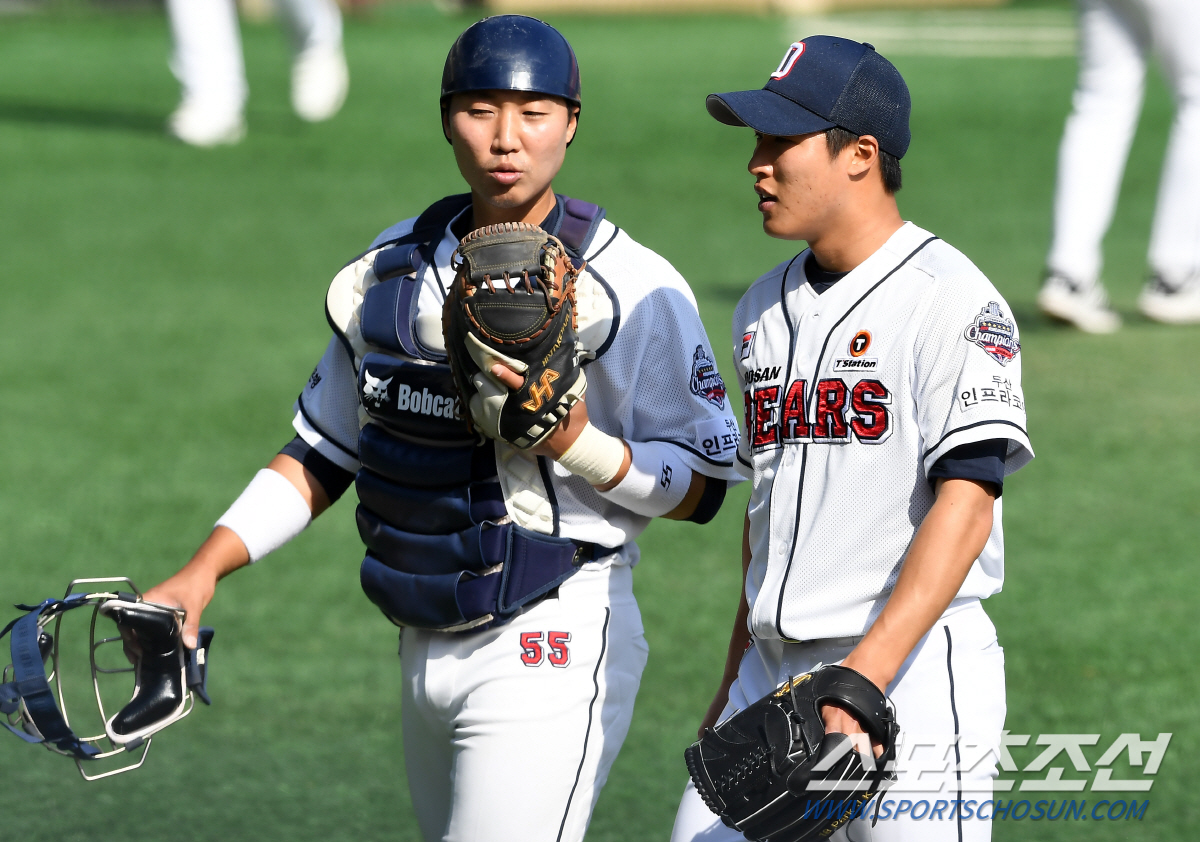 두산 베어스 선수단이 29일 잠실야구장에서 자체 청백전을 가졌다. 6회초 3실점을 허용한 두산 박종기가 이닝을 마친 뒤 포수 이흥련과 대화를 나누고 있다. 잠실=박재만 기자 pjm@sportschosun.com/2020.03.29/