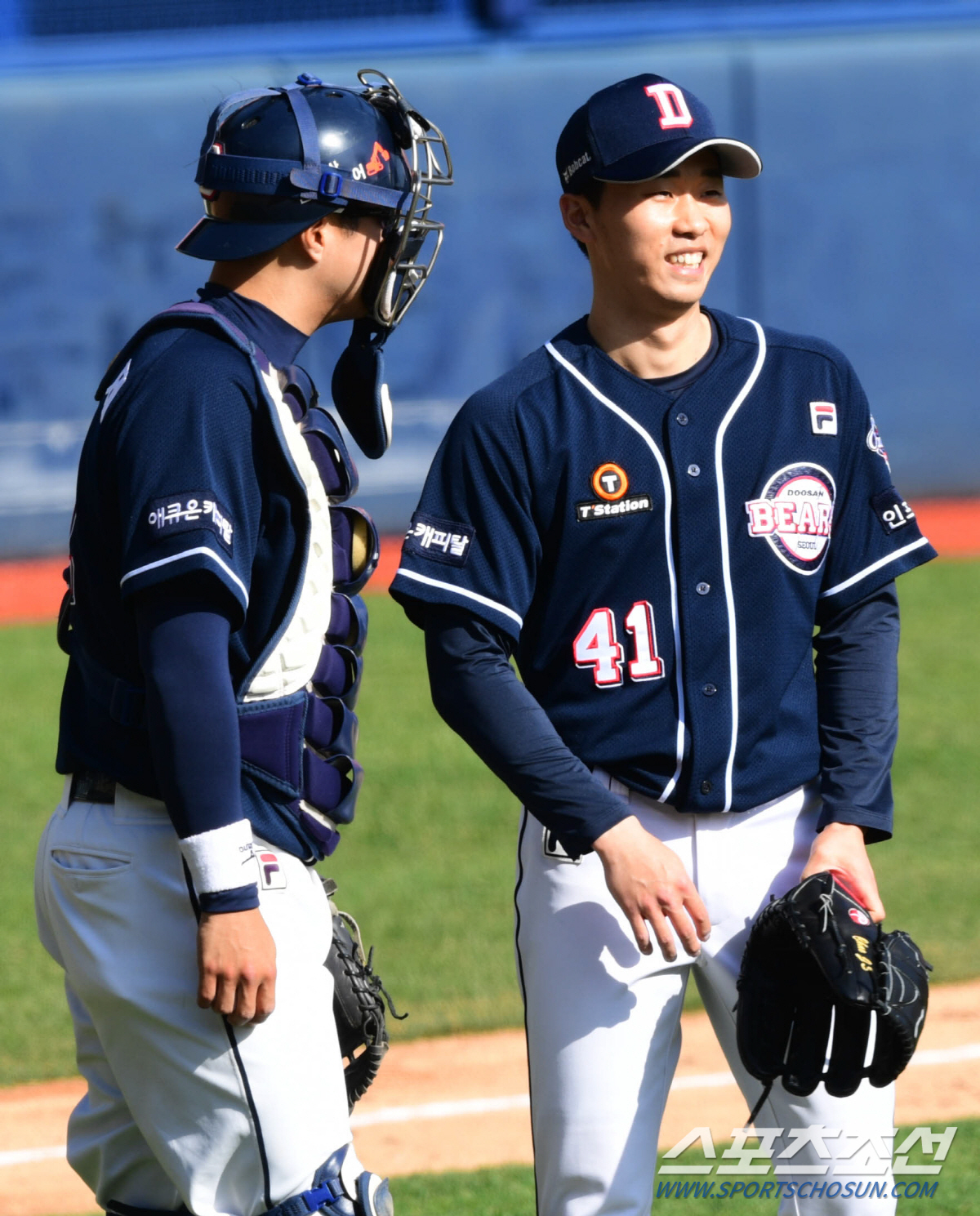 프로야구 두산 베어스가 27일 서울 잠실야구장에서 자체 청백전을 가졌다.청팀 마무리 채지선과 최용제가 팀 승리를 확정지은후 환하게 있다. 잠실=최문영 기자 deer@sportschosun.com /2020.03.27/