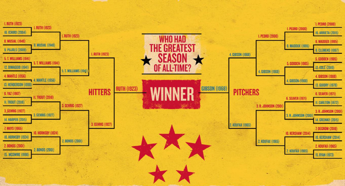 루스는 1923년 타율 3할9푼3리, OPS 1.309, 41홈런, 130타점, 170볼넷을 기록했고, 깁슨은 1968년 22승9패, 평균자책점 1.12, 268탈삼진을 올렸다. 두 선수의 해당 시즌 성적 중 어느 쪽이 더 위대한 지 우열을 가리자는 것이다.