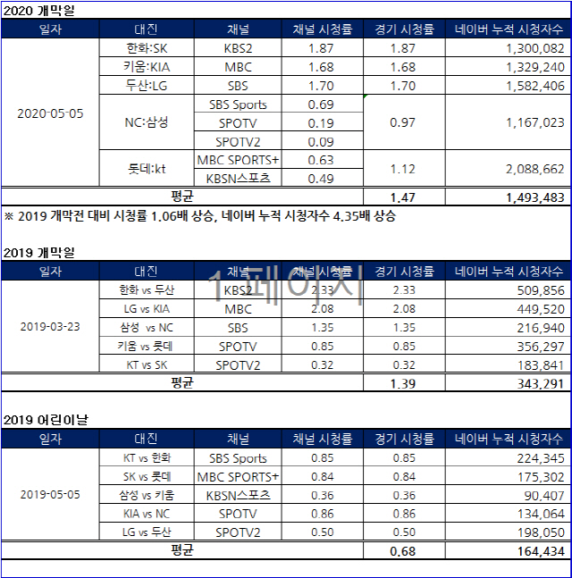 TV 시청률도 올랐다. 개막전 5경기 평균 시청률은 1.47%. 지난해 개막전 5경기 평균인 1.39%보다 조금 높은 수치다. 지난해 5월5일 5경기 평균 시청율은 0.68%에 그쳤다.