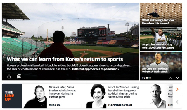 야후스포츠는 메이저리그(MLB)는 언제쯤 개막을 할 수 있을지, 또 어떤 준비가 필요한지 한국과 KBO리그 사례를 예로 들었다. 특히 "한국은 코로나19 초기 확산때 심각한 위협을 받았었다. 한국(남한)은 미국 인구의 15%에 해당하지만, 지리적 공간은 0.4% 미만으로 인구밀도가 높다. 또 발원지인 중국과 가깝다. 하지만 한국은 진단 키트를 통해 많은 테스트를 실시했고, 정부의 좋은 대처를 통해 추가 확산을 빠르게 방지했다. 지난 4월 58세 남성이 코로나19 확진을 받은 직후 한국은 그와 접촉할 가능성이 있는 1000명 이상의 사람들을 확인했고, 인터뷰도 했다. 미국에서는 이런 비슷한 시스템을 실현할 수 없다"고 설명했다.