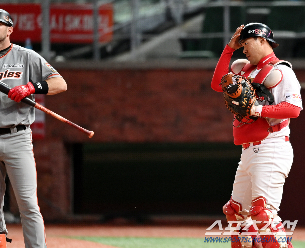 2020 KBO리그 한화 이글스와 SK 와이번스의 경기가 7일 인천 SK행복드림구장에서 열렸다. 5회초 2사 1루 한화 호잉 타석 때 1루주자 정진호의 2루 도루를 막지 못한 SK 포수 이재원이 답답해하고 있다. 인천=정재근 기자 cjg@sportschosun.com