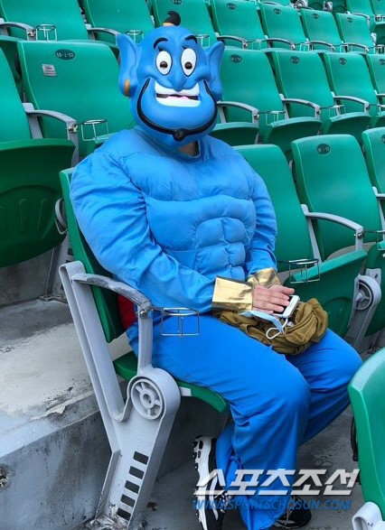 [인천=스포츠조선 권인하 기자]SK 와이번스는 직접 야구장에서 응원을 하지 못하는 팬들을 위해 파울볼을 잡아서 선물하는 인원을 따로 배치했다. 영화로도 잘 알려진 천일야화의 '알라딘과 이상한 램프'에 나오는 소원을 들어주는 램프의 요정 지니의 분장을 시켰고 이름도 '지니'로 했다. '지니'는 파울볼을 주워 SK 응원단과 응원전을 함께 한 팬들에게 선물한다.