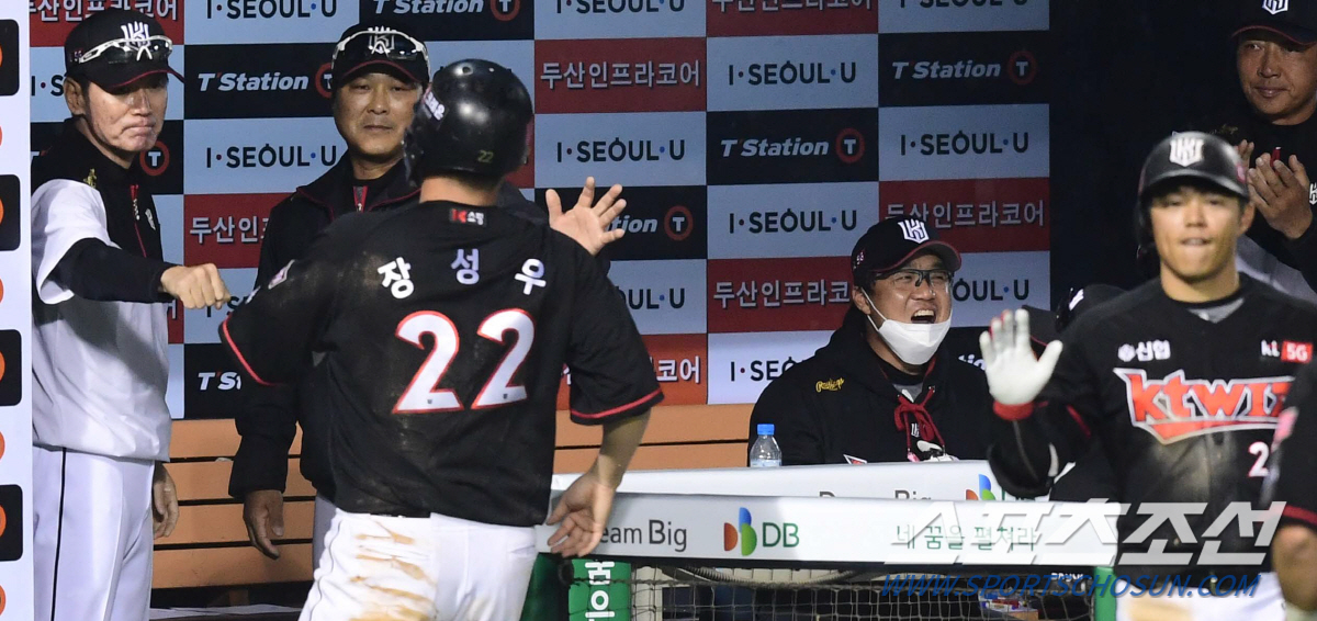 2020 KBO리그 두산베어스와 KT위즈의 경기가 8일 서울잠실야구장에서 열렸다. KT 장성우가 5회초 1사 2,3루에서 배정대의 2타점 적시타때 득점을 올리고 있다. 잠실 =최문영 기자 deer@sportschosun.com /2020.05.08/