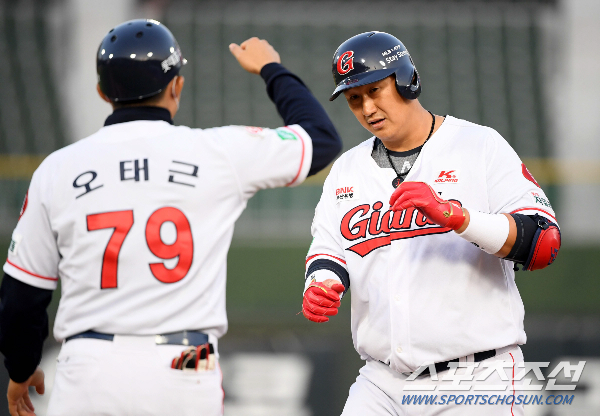 두산 베어스와 롯데 자이언츠의 2020 KBO 리그 경기가 12일 부산 사직구장에서 열렸다. 1회말 2사 1루, 롯데 이대호가 좌익수 앞 안타를 치고 오태근 1루 코치와 하이파이브를 하고 있다. 부산=허상욱 기자 wook@sportschosun.com