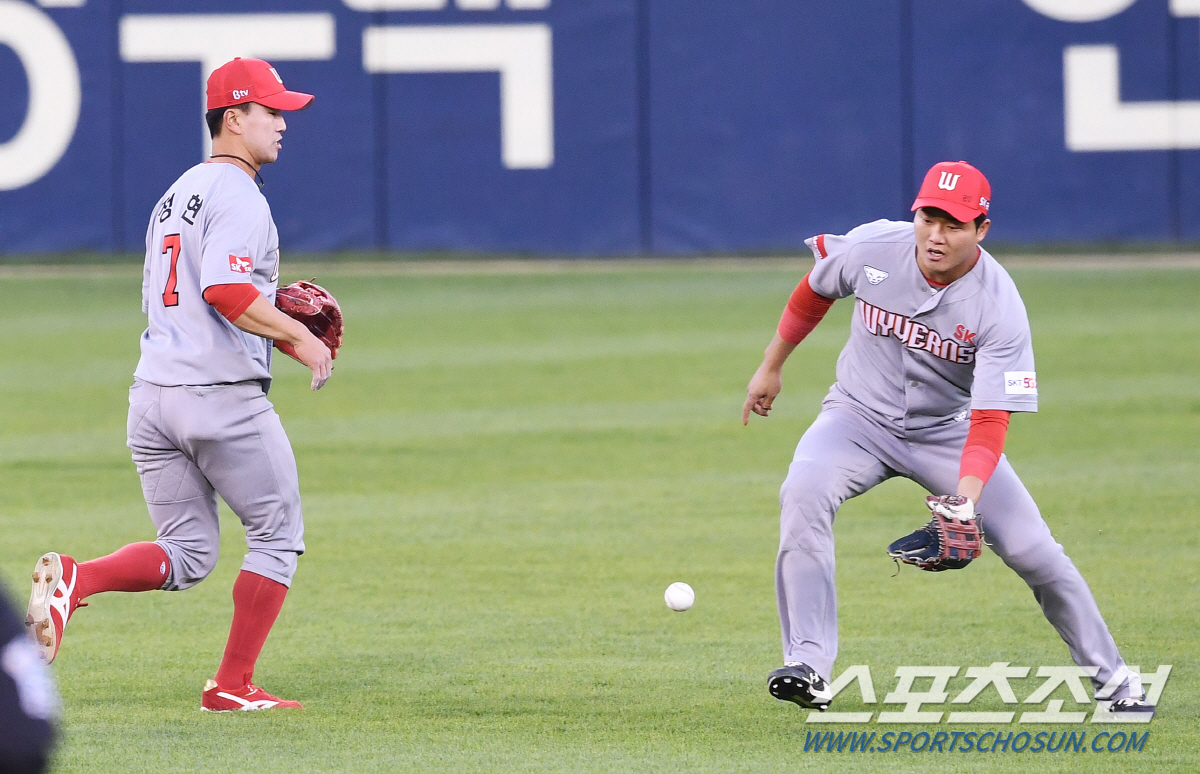 13일 잠실야구장에서 KBO리그 LG 트윈스와 SK 와이번스의 경기가 열렸다. 2회 LG 채은성의 뜬볼 타구를 놓치고 있는 SK 정현 유격수와 정진기 중견수. 타구는 안타로 기록됐다. 잠실=송정헌 기자 songs@sportschosun.com/2020.05.13/