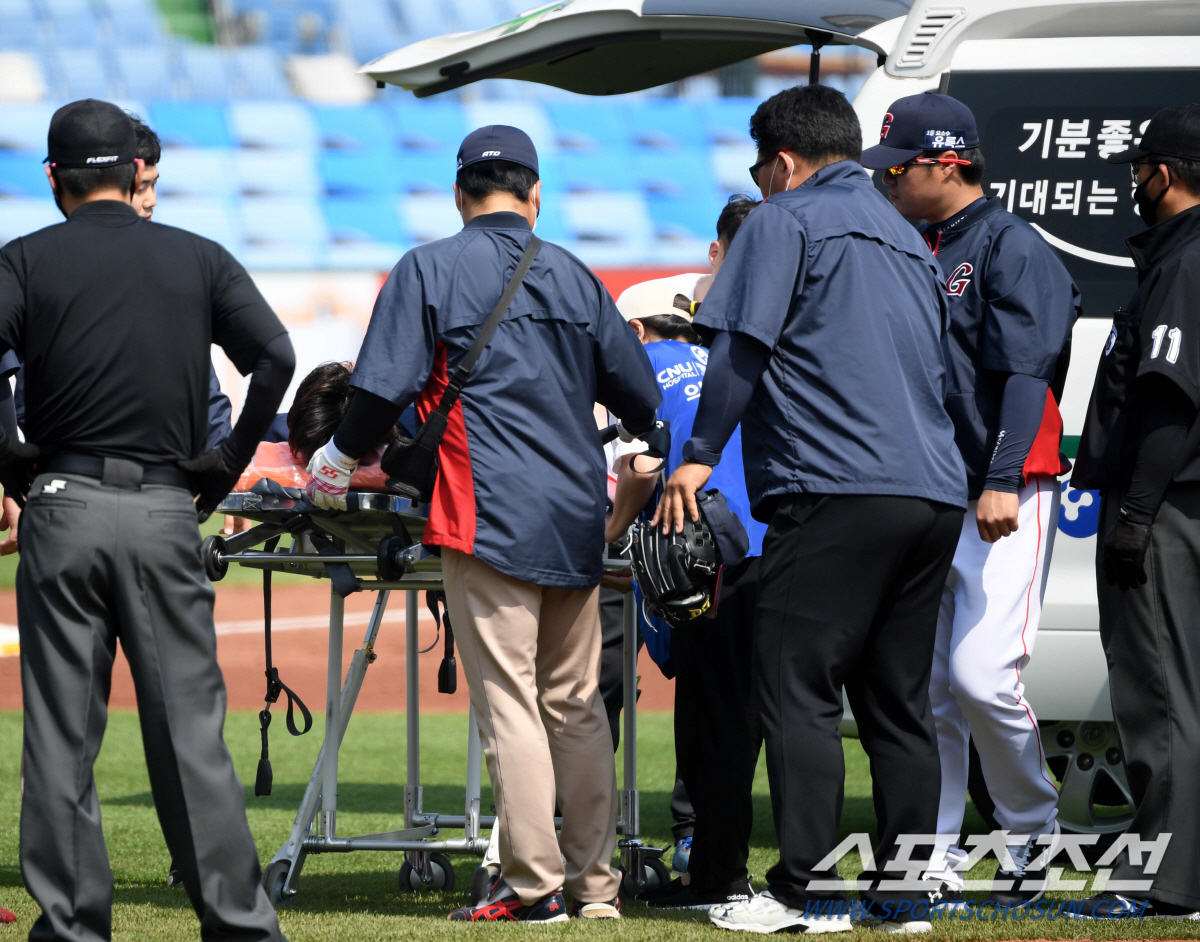 롯데 자이언츠와 한화 이글스의 2020 KBO리그 경기가 17일 대전 한화생명 이글스파크에서 열렸다. 롯데 이승헌이 3회말 1사 1,2루 상황, 한화 정진호의 타구를 맞고 그라운드에 쓰러졌다. 들것에 실려 병원으로 이송되는 이승헌의 모습. 대전=허상욱 기자 wook@sportschosun.com/2020.05.17/