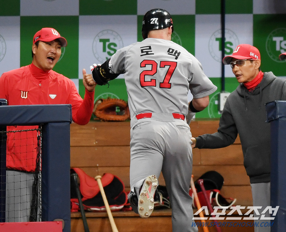 2020 KBO리그 SK 와이번스와 키움 히어로즈의 경기가 20일 서울 고척스카이돔에서 열렸다. 3회초 2사 SK 로맥이 역전 솔로포를 치고 들어오며 염경엽 감독과 이진영 코치의 축하를 받고 있다. 고척=정재근 기자 cjg@sportschosun.com/2020.05.20/